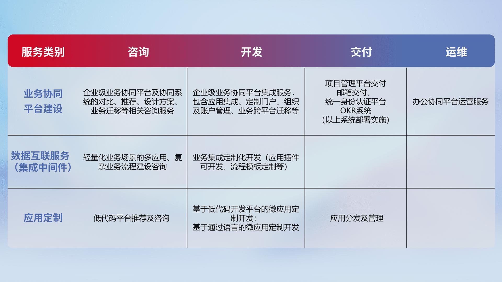 针对特定行业场景的全代码开发服务,,精确足满足客户业务服务及系统定制化需求。。重点服务汽车、、农业、、制造业等高端高质量客户。。提供如专业管理系统、、、、定制化门户、、业务工作台等开发落地。。